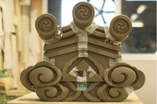 今日の古彩色瓦“銀古美”の窯積み風景から…神奈川の社寺本堂改修につきお預かりした古鬼瓦を復元製作したものを、いよいよ一発勝負の焼成です! 当時の鬼師の名前か屋号か「喜代」と刻印された経ノ巻鬼瓦…時代を超えて当時の“想い”が引き継がれるのは一つの浪…