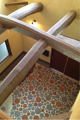 -Design works * kawara - もう8年前!阿波の家…玄関土間のモルタル下地が出来たので、円坐−maruza−のデザインレイアウトにお邪魔してきました。 土色の珪藻土壁とダイナミックな梁が印象的な吹き抜け二階から見下ろす完成したレイアウトパターン!! 表現…