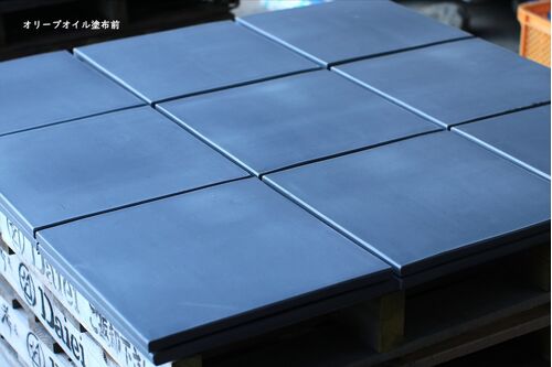 今日の“銀古美”の窯出しから… まだまだ焼いています、手作り400角甃(しきがわら)! 寸法と捻れの選別のあと、今回プロジェクトの依頼によりオリーブオイル塗布。 せっかくなのでエキストラバージン(笑) 焼きたての銀古美特有“寂び感”ある景色も美しいが、塗…
